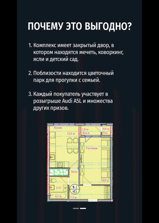 Комплекс создан для семей с работой в центре, успешных предпринимателей, бизнесменов и всех, кто предпочитает жить у эпицентра городской жизни — без долгих поездок к магазинам, школам или офисам.Комфорт на высоте: потолки 3,3 м и панорамные окна ☀️