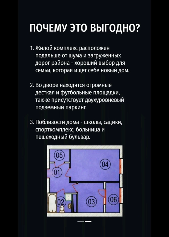 Выберите квартиру мечты: от компактных студий для молодых профессионалов до просторных апартаментов для больших семей 👨‍👩‍👧‍👦. Каждая — с панорамным остеклением, эргономичной зоной и потоком естественного света ☀️.Зелёный оазис во дворе 🌳: детские и спортивные площадки ⚽, зоны барбекю и отдыха — всё для счастливого отдыха с близкими .